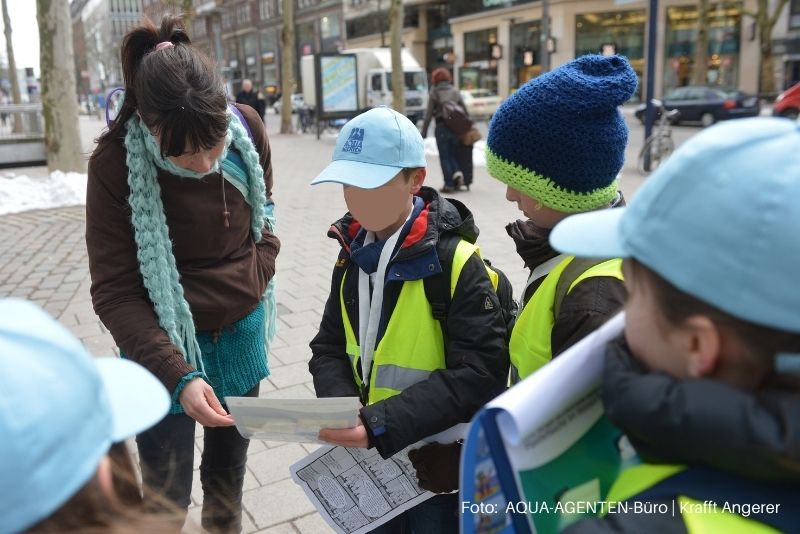 Bei den AQUA-AGENTEN-Aktionstagen kommen wir aus der AQUA-AGENTEN-Zentrale in die Klasse. Von dort geht es in betreuten Kleingruppen auf die Straße, um Erwachsene mithilfe kreativer Materialien zu interviewen. Die Kinder klären die Erwachsenen über Wasserthemen auf und fragen nach, welchen Beitrag jede und jeder Einzelne zum Schutz des Wassers leisten kann.