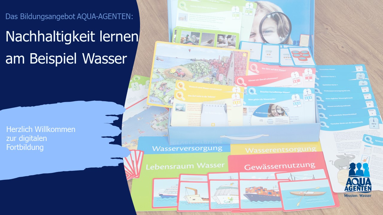 Mehrmals im Jahr werden für Lehrkräfte Fortbildungen zum AQUA-AGENTEN-Koffer angeboten – als Präsenzveranstaltung oder digital. Dort wird das didaktische Konzept der AQUA-AGENTEN vorgestellt – mit einem Schwerpunkt auf Bildung für eine nachhaltige Entwicklung (BNE). Es folgt eine praxisorientierte Einführung in die Anwendung des AQUA-AGENTEN-Koffers im Unterricht, bei der die Teilnehmer*innen einen umfassenden Überblick über die 34 Aufgaben und Materialien des AQUA-AGENTEN-Koffers erhalten. Nähere Infos zum AQUA-AGENTEN-Koffer finden Sie hier.